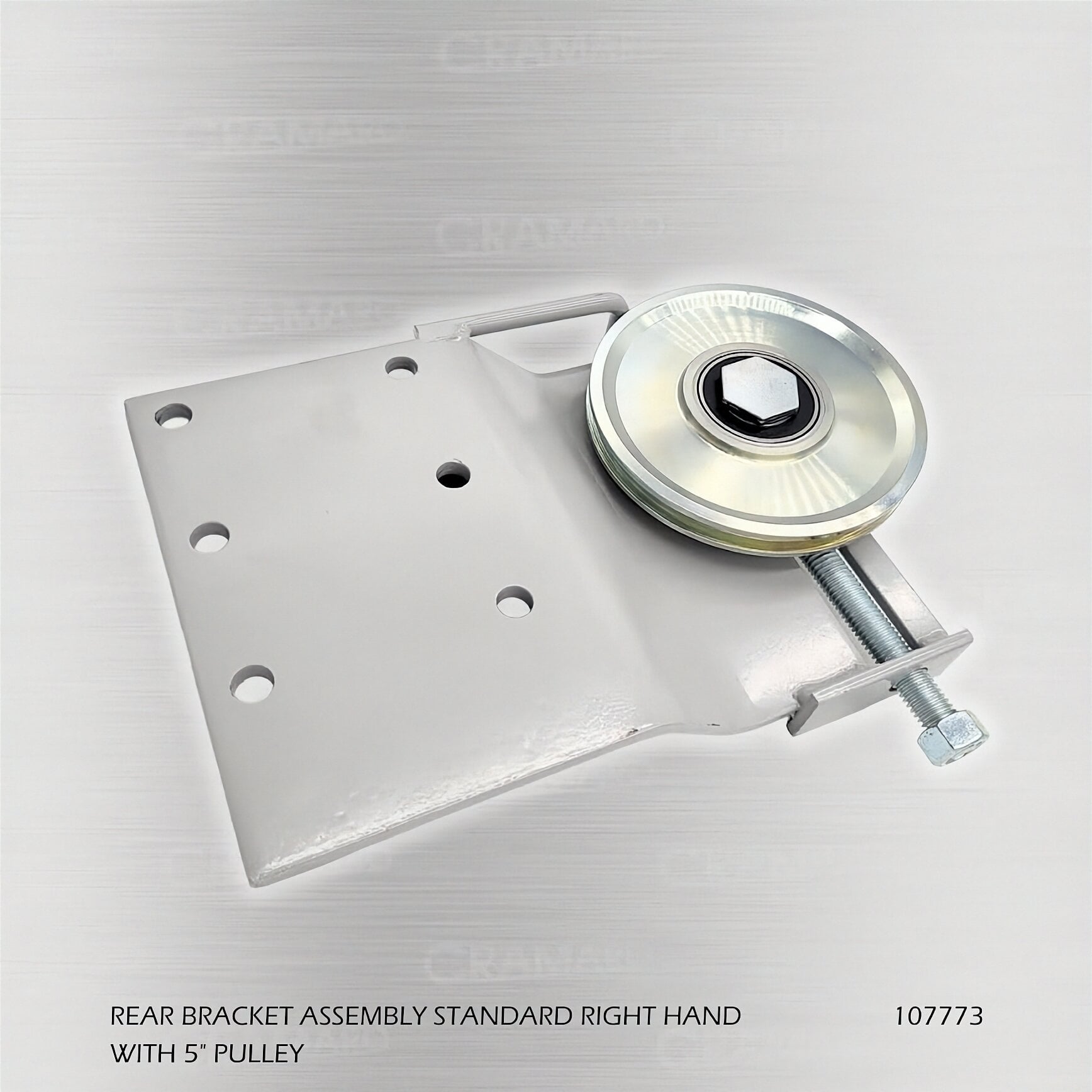 The Cramaro 107773 Rear Bracket Assembly (Right-Hand) is an OEM replacement part designed for Slide-N-Go™ (SNG) tarp systems. It is installed at the rear of the system and includes a 5″ cable pulley to guide the cable during operation.